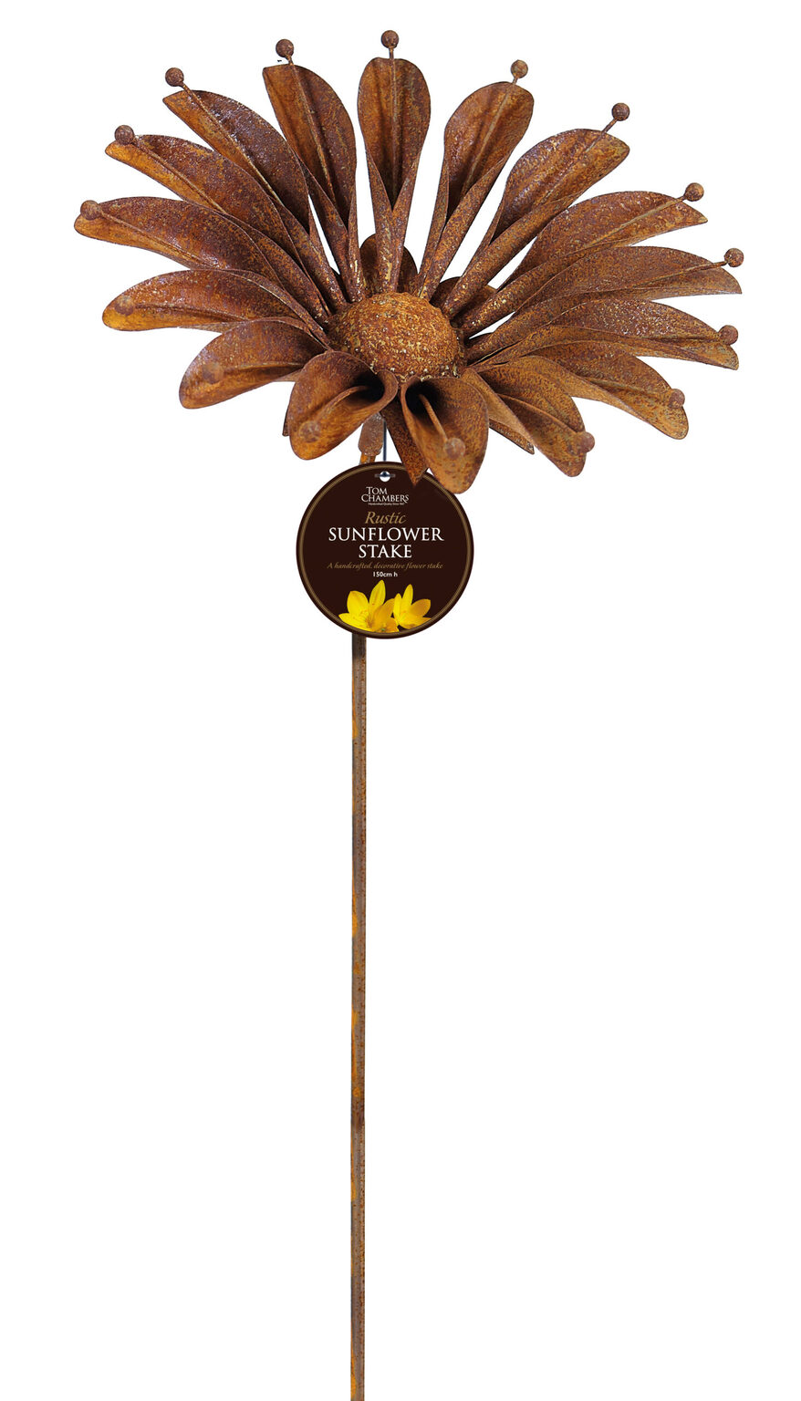 Rustic Sunflower plant stake, handcrafted from raw metal without coating to create an attractive garden feature. The stake will rust and weather naturally over time in the garden and can be pushed into soil in flower beds and garden borders.